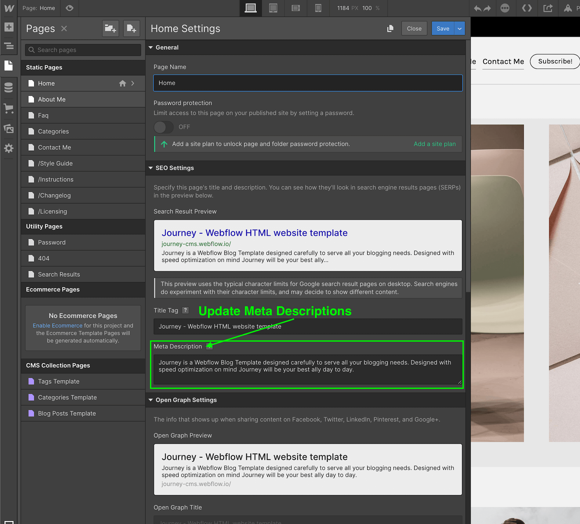 1. Go to Pages Panel, click on the Settings (gear) Icon.